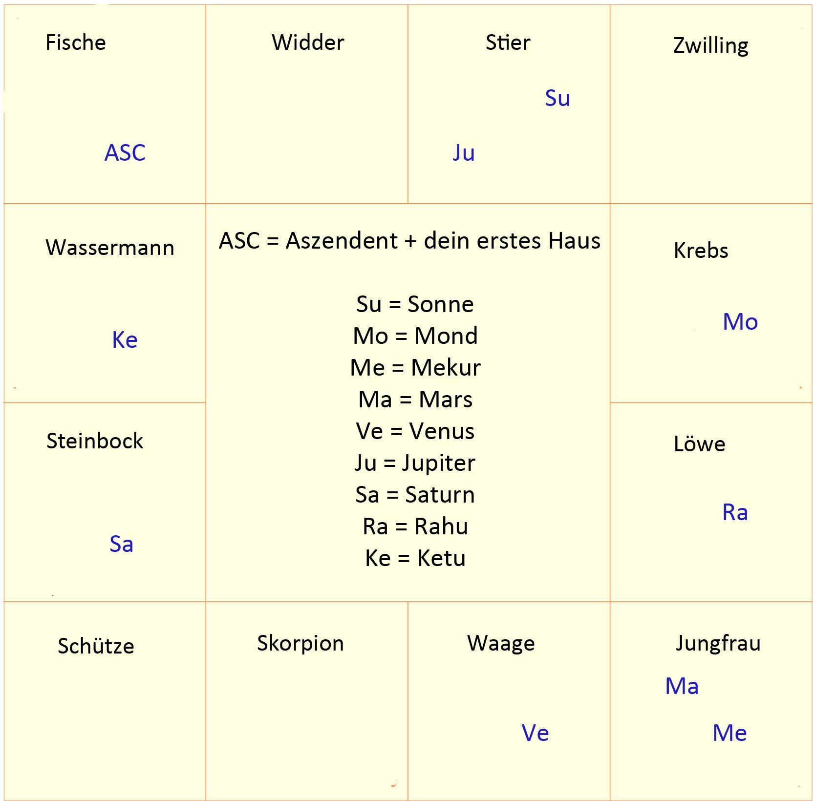 Die Zeichen: Diese sind fest den Kästchen zugeordnet, siehe links im Beispiel. Du kannst sie in dieser Reihenfolge so auf dein Horoskop übertragen.